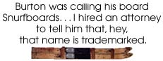 The sport was called Snurfing, but the way, it was not called snowboarding. And that had a lot of good connotations because it could sound sort of dirty [laughter]. And there was a lot of fun things going on about that. When he got started and Burton was calling his board Snurfboards, and mine was a Snurfer, and I didn't like that because he was taking my name away and I hired an attorney to tell him that, hey, that name is trademarked. Well, I wish I hadn't done it now, because that's when the sport became snowboarding. He couldn't use the word Snurfer or Snurf anywhere in his stuff so he called it the Burton Snowboard and that kicked off the whole sport.